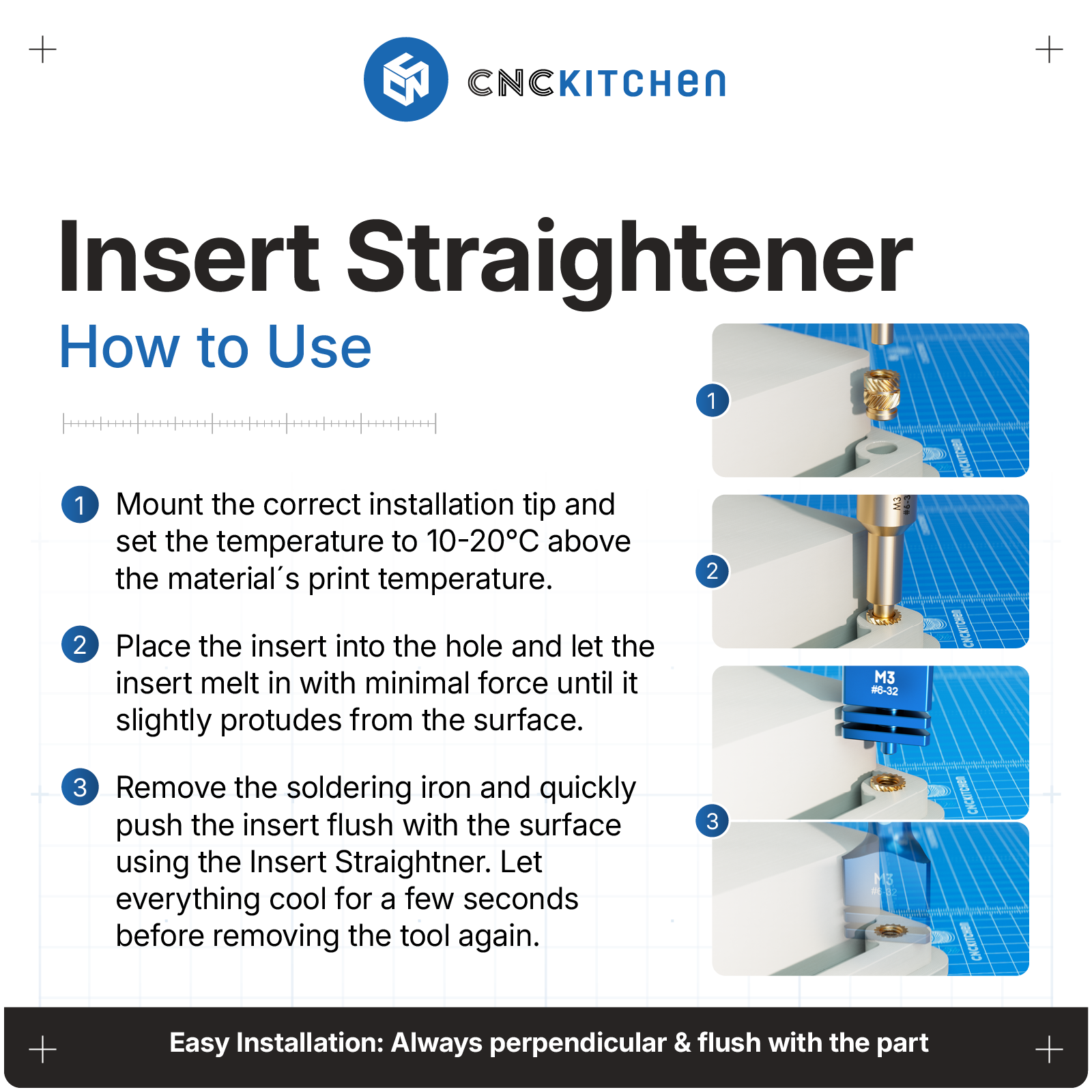 Insert Straightener to niezbędne narzędzie dla każdego entuzjasty druku 3D i inżyniera, który wymaga najwyższej precyzji podczas montażu gwintowanych wkładek termicznych (heat-set inserts). Zapomnij o krzywo osadzonych gwintach – ten przyrząd gwarantuje idealnie prostopadłe pozycjonowanie insertów M2 oraz M2.5 względem powierzchni modelu.